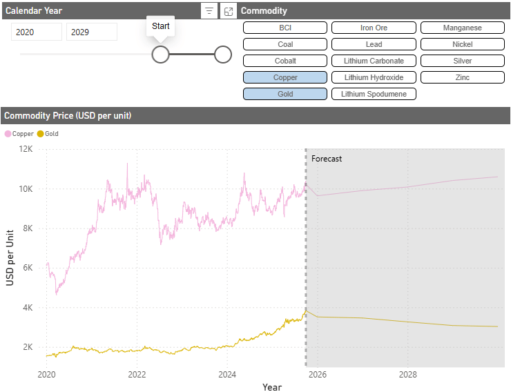 Historical and forecast prices for a variety of commodities